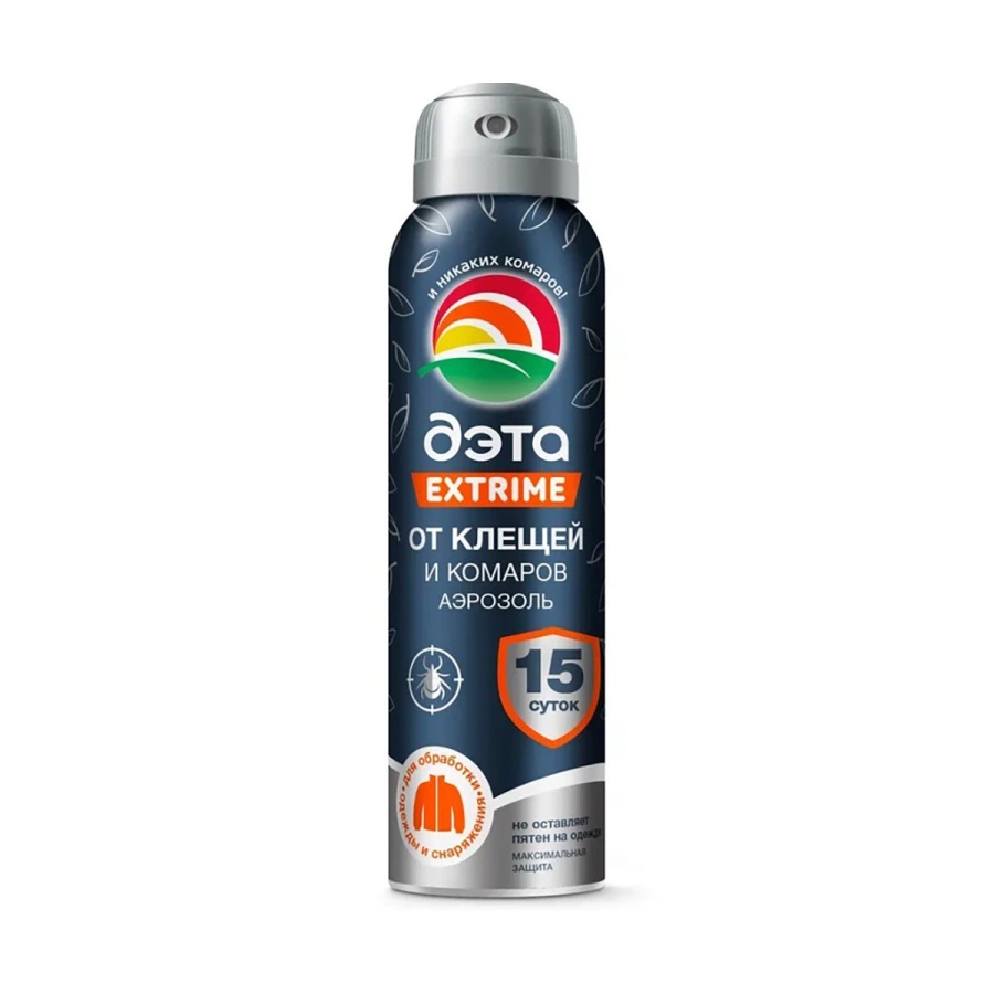 Средство в аэрозольной упаковке«Дэта» обеспечивает надежную защиту от лесных и таежных (иксодовых) клещей– переносчиков и возбудителей клещевого энцефалита и болезни Лайма. Не оставляет пятен на ткани.