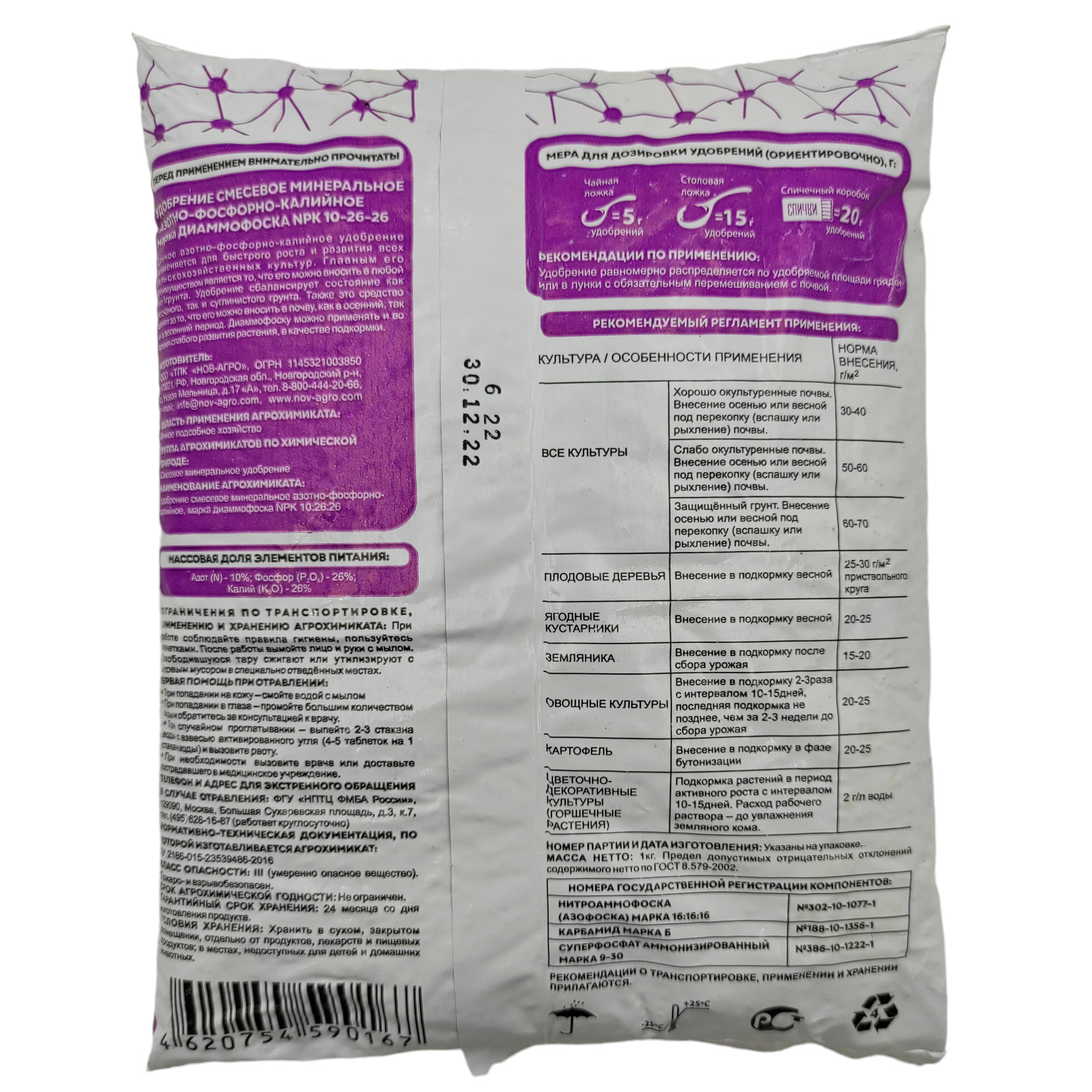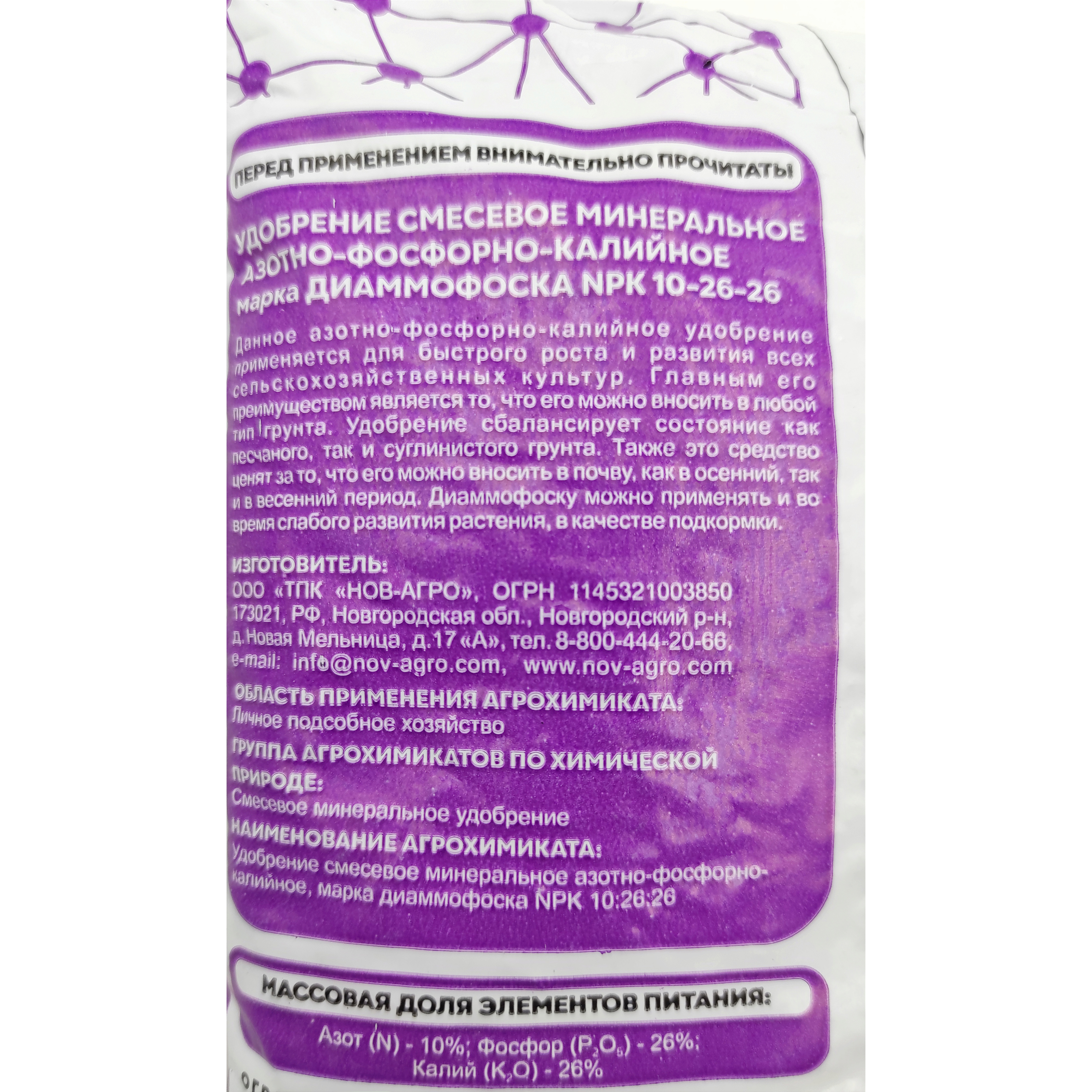 - состав: азот (N) 10%, фосфор (Р) 26%, калий (К) 26%;