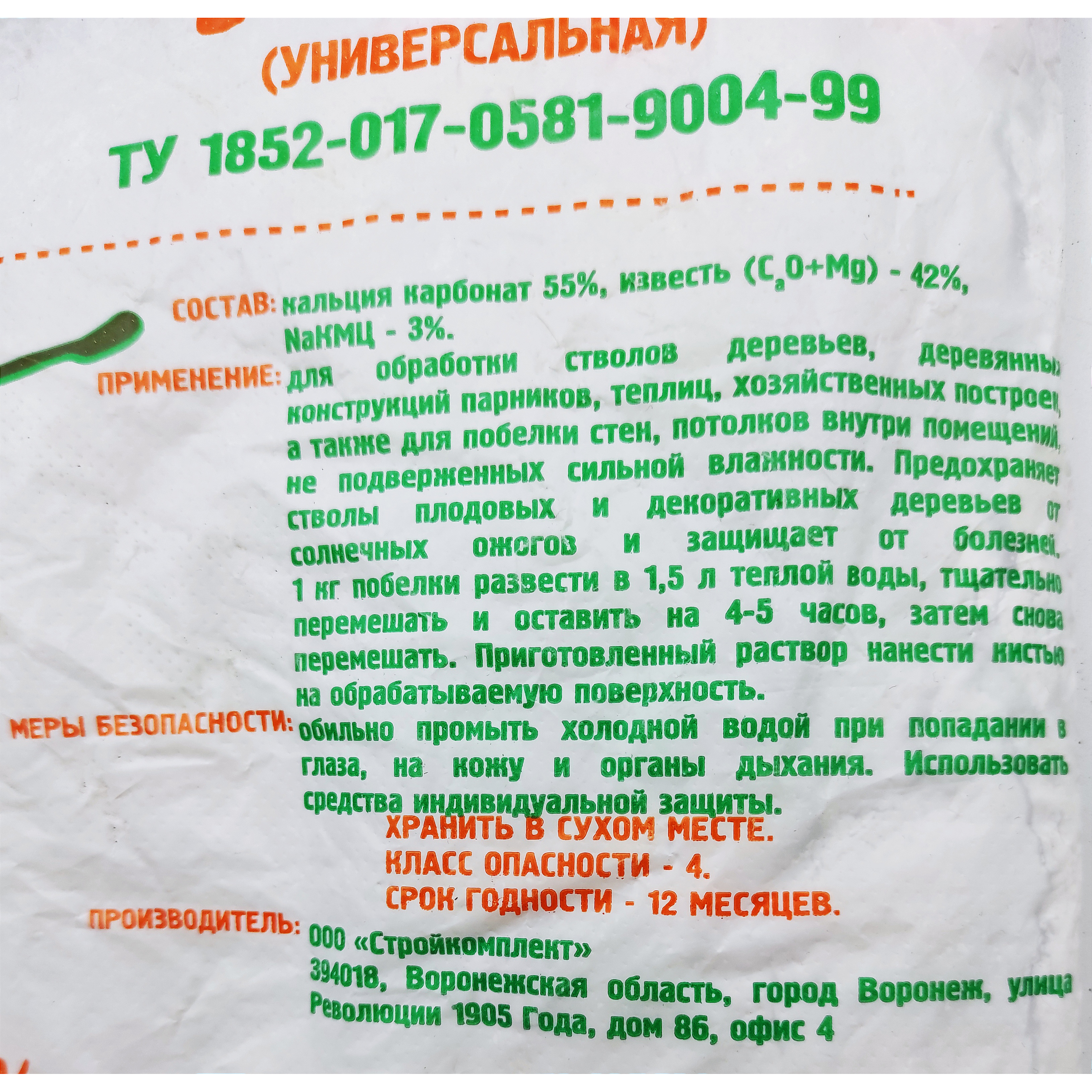 1кг побелки развести в 1,5л теплой воды, тщательно перемещать и оставить на 4-6 часов, затем снова перемешать. Приготовленный раствор нанести кистью на обрабатываемую поверхность.