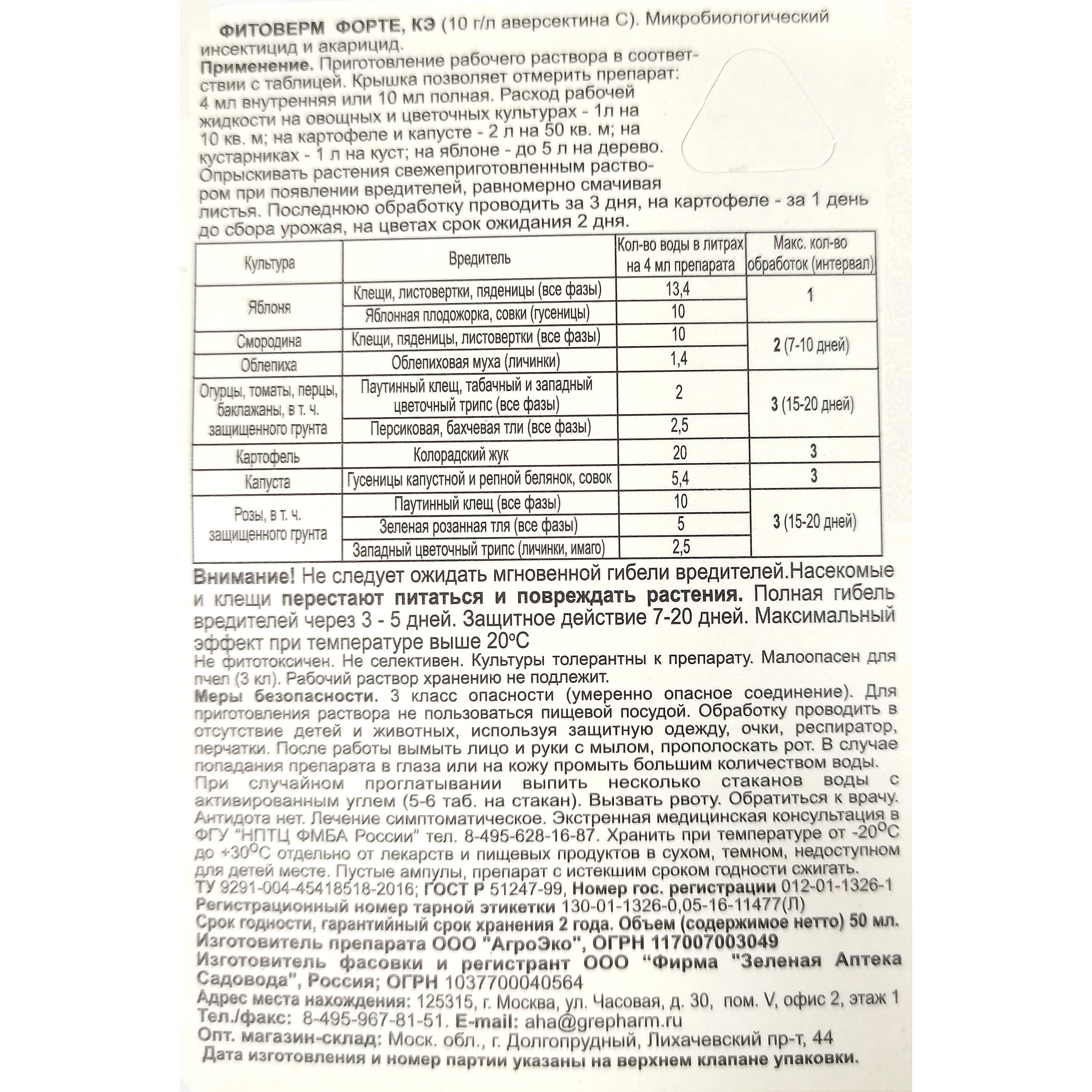 Фитоверм Форте — концентрированный препарат контактно-кишечного действия, предназначенный для борьбы с целым рядом садовых и огородных вредителей, среди которых: клещи, тля, листогрызущие гусеницы, колорадский жук и некоторые другие.