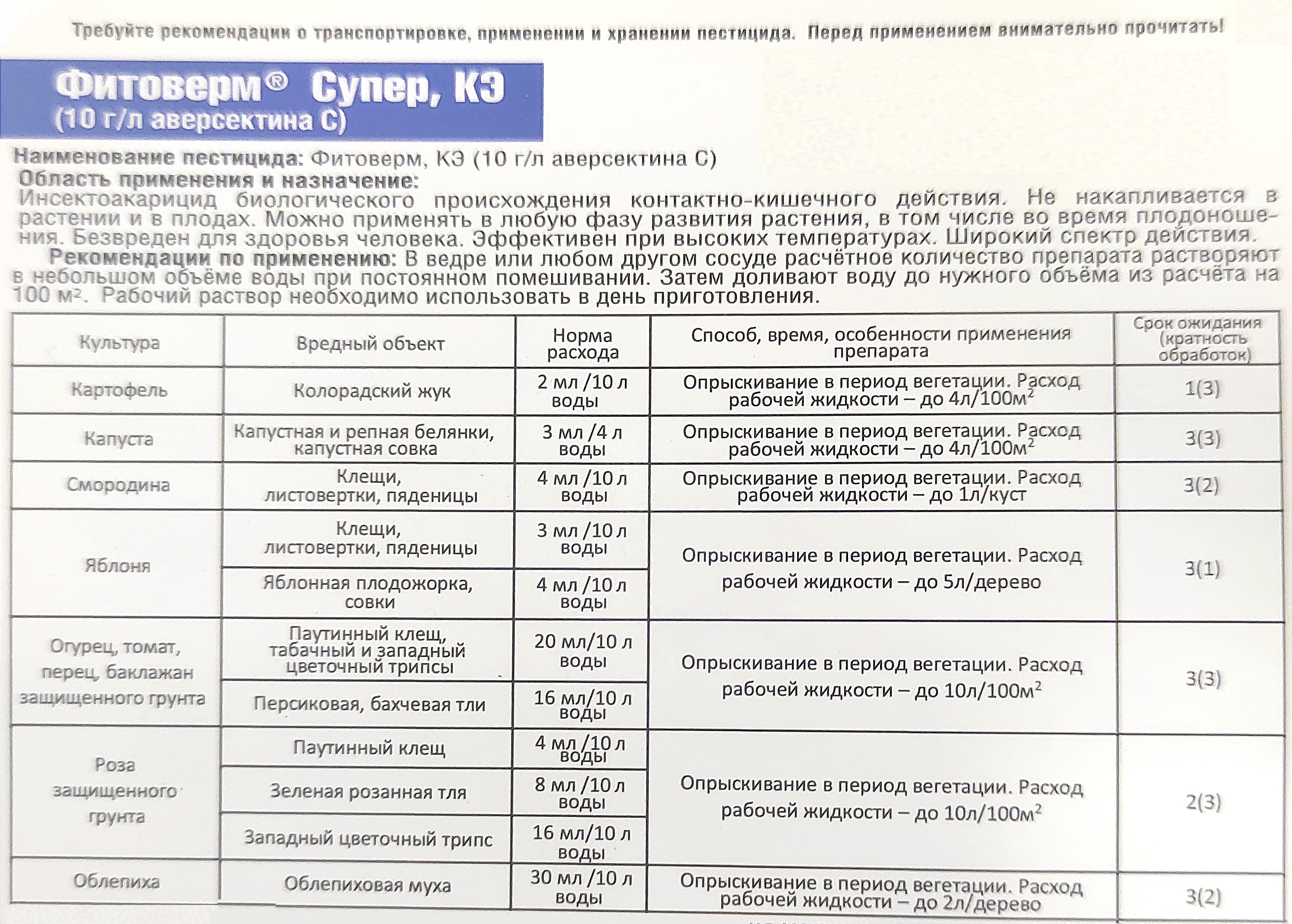 - Фитоверм не обладает способностью проникать через растительные мембраны (внутрь растения, плода), следовательно, не накапливается в растениях и плодах. Что делает его применение доступным во время плодоношения и безвредным для здоровья человека.