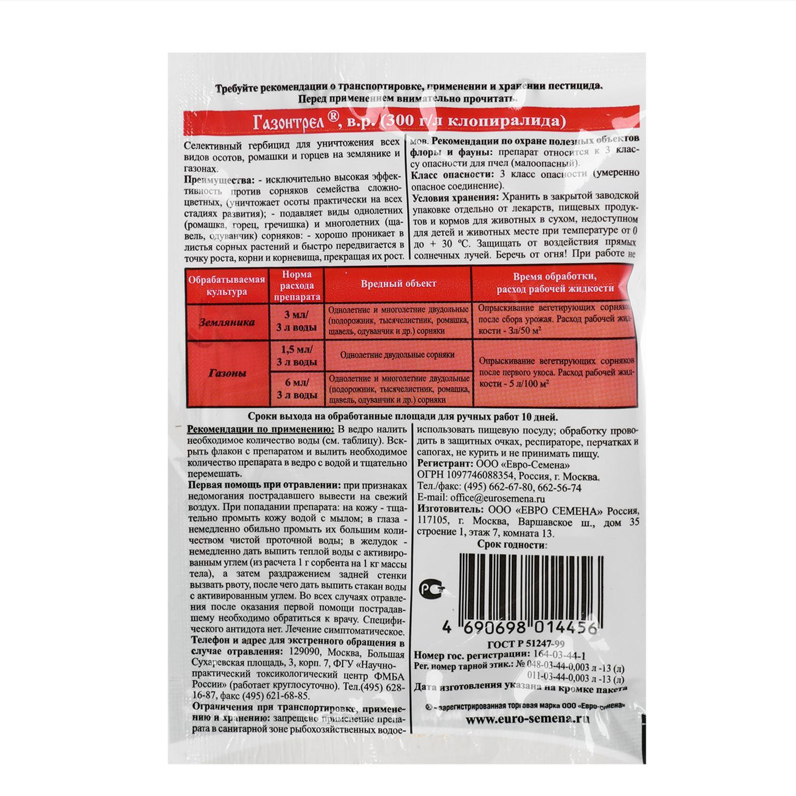 Селективный гербицид для уничтожения однолетних (ромашка, горец, гречишка) и многолетних (щавель, одуванчик, подорожник, тысячелистник) сорняков на землянике и газонах. Исключительная эффективность против сорняков семейства сложноцветных - уничтожает осоты практически на всех стадиях развития.