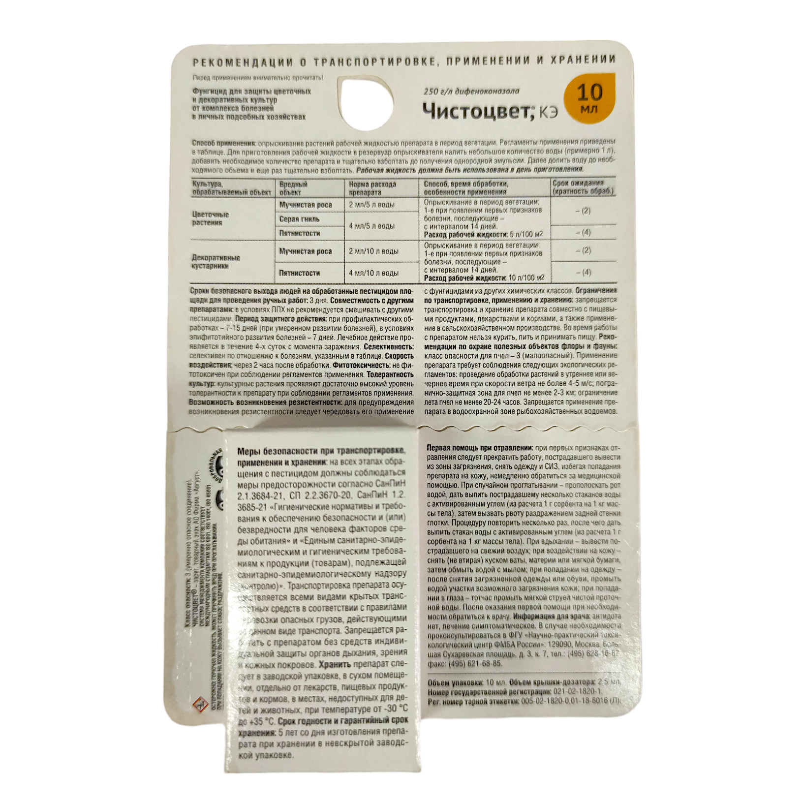 - При поражении цветов мучнистой росой, появлении первых признаков болезни, растворите 2 мл препарата в 5 литрах воды. Интервал между опрыскиванием— две недели. При повреждении культур серой гнилью и пятнистостью- 4 мл/5 л воды.
