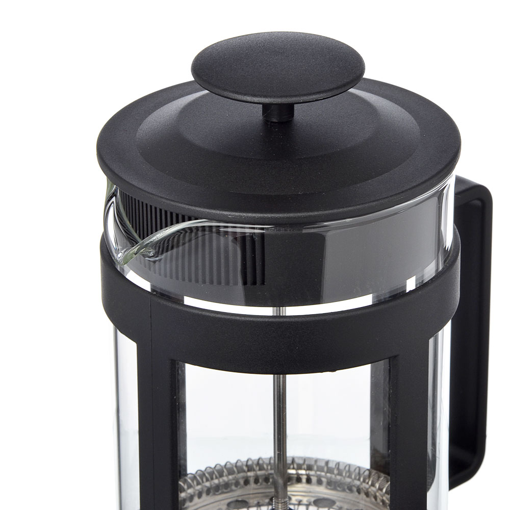 Френч-пресс для заваривания чая и кофе. Стеклянная колба хорошо сохраняет тепло, но удобная пластиковая ручка при этом не нагревается и не обжигает руки.