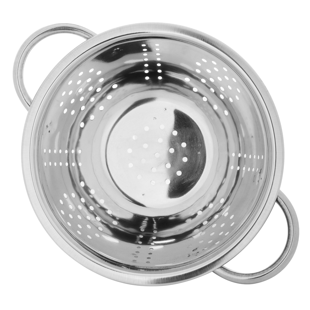 Дуршлаг на ножке, с двумя «С» - образными ручками, имеет классическую круглую форму, предназначен для процеживания продуктов. Практичный и удобный, изготовлен из высококачественной нержавеющей стали. Удобная ножка позволит зафиксировать дуршлаг на ровной поверхности, например, в раковине. В посуде подобного типа также удобно перетирать пищу (например, творог), промывать овощи или фрукты. Рекомендовано для слива как холодных, так и горячих жидкостей.