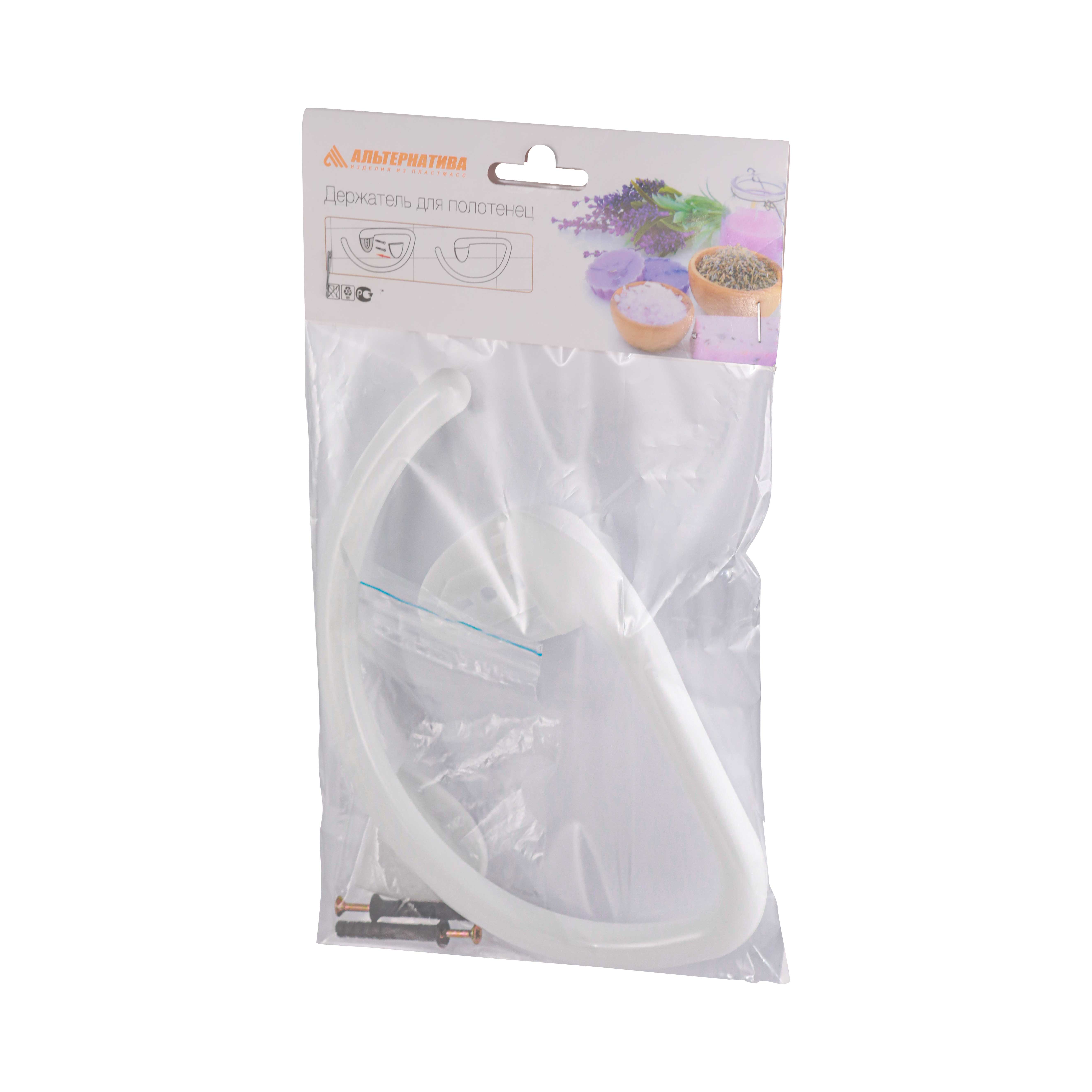 Изделие имеет два составляющих: изогнутое основание для подвешивания полотенца, заглушка. Изделие крепится к стене с помощью двух дюбель-гвоздей (дюбель-гвозди входят в комплект).