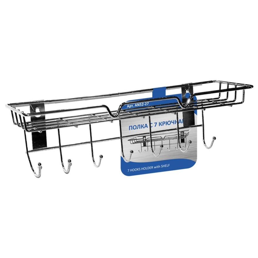 Удобная полка с 7 крючками – универсальное приспособление для ванной комнаты и кухни. Позволяет разместить моющие средства, мочалки, губки, щетки, развесить полотенца, прихватки, кухонную утварь и другие принадлежности. С этим изделием домашние мелочи всегда будут под рукой и содержаться в порядке. Подойдет для любой кухни или ванной комнаты, занимает мало места.