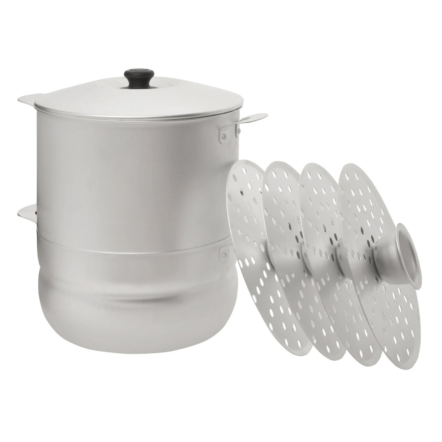 В комплект входят: резервуар для воды, корпус для решеток с клапанами, 4 решетки с клапанами, крышка с пластиковой ручкой. Кастрюля снабжена удобными алюминиевыми ручками.