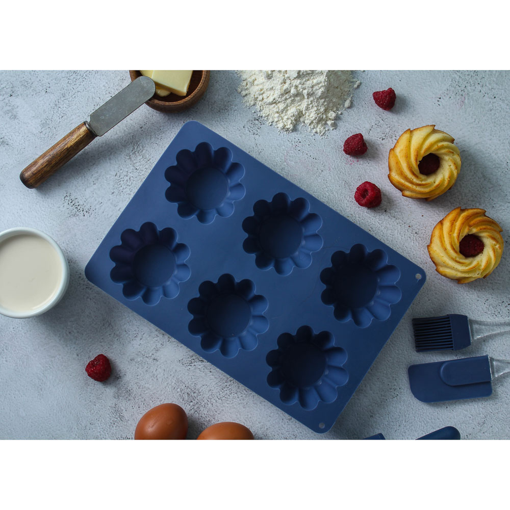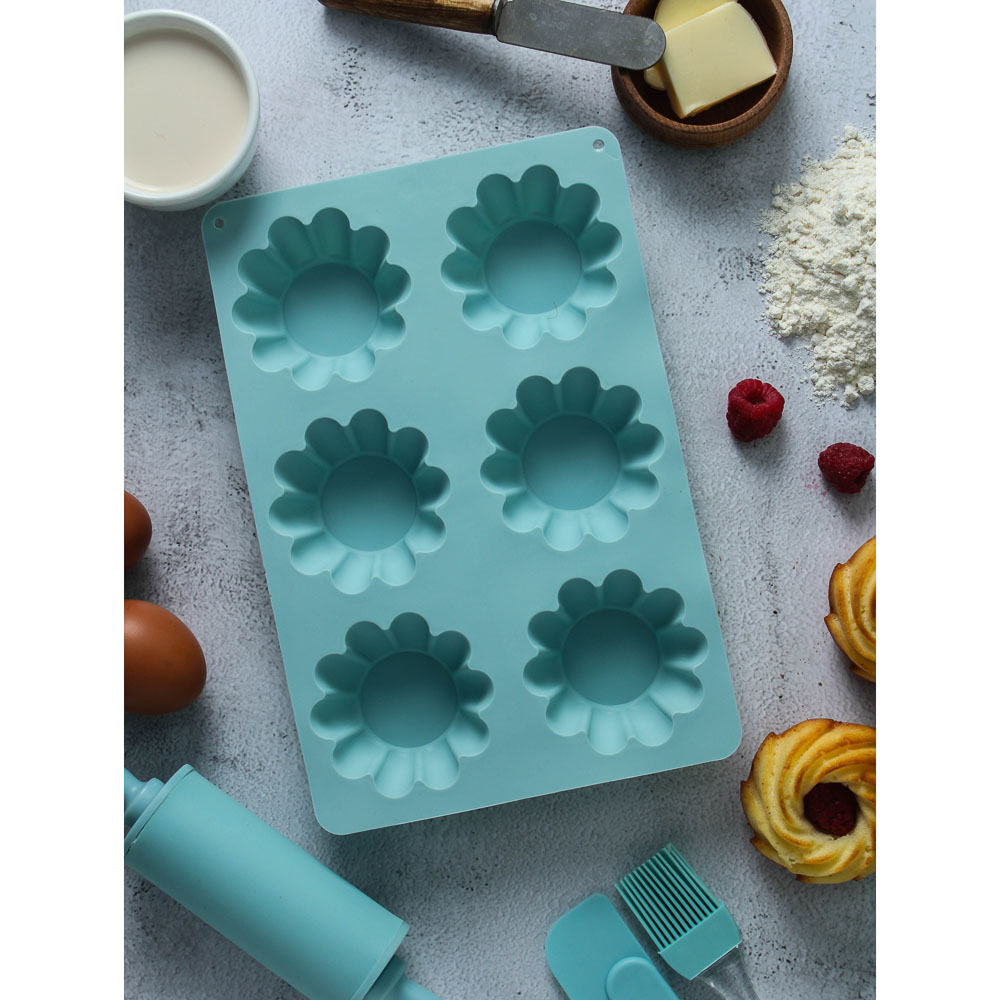 Форма для выпечки размером разделенная на 6 круглых ячеек с ровным гладким дном и гофрированной стенкой, предназначена для выпечки изделий из теста в духовых шкафах. Силиконовая форма отличается стойкостью к высоким температурам, а также обладает антипригарными свойствами, за счет чего выпечка легко вынимается и не пригорает. Форма не прихотлива, ее легко мыть и удобно хранить.