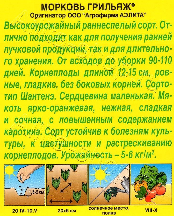 Новый, высокоурожайный среднеспелый сорт. Период от всходов до хозяйственной годности 90-110 дней. Корнеплоды конические (сортотип Шантенэ), длиной 12-15 см, массой 150-250 г, с маленькой сердцевиной, не растрескиваются. Мякоть оранжевая, нежная, великолепного вкуса, с повышенным содержанием каротина. Рекомендуется для потребления в свежем виде и кулинарной переработки. Корнеплоды отлично транспортируются и хранятся в зимний период.