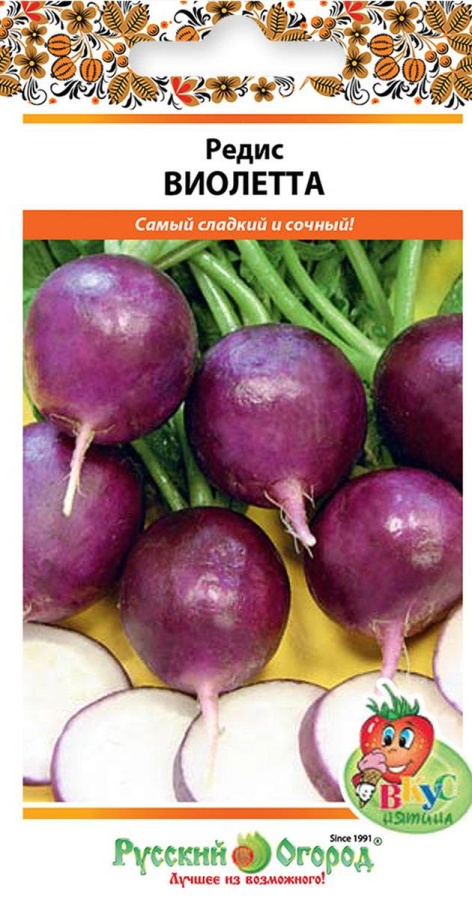 Раннеспелый сорт с необычной фиолетовой окраской. Корнеплод округлый, диаметром 3 см. Мякоть белая, хрустящая, сочная, малоострая.