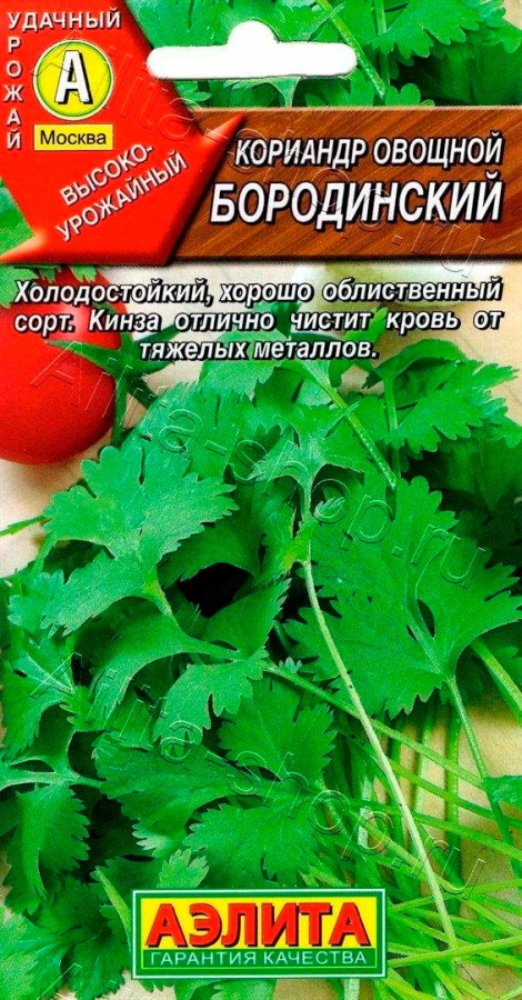 Среднеспелый сорт, период от полных всходов до начала стеблевания 40-45 дней. Растение компактное, высотой 70 см. Масса одного растения 25-30 г, урожайность зелени 2,5 кг/м2. Зелень обладает приятным нежным вкусом и изысканным ароматом, используется в свежем виде, - для оформления блюд и в салатах.