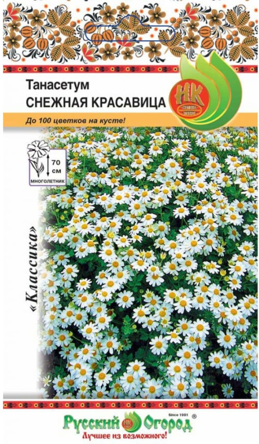 Многолетник. Высота 70см. Диаметр 2см. Необыкновенный танацетум раскроет свои многочисленные белоснежные цветки, и на протяжении всего лета будет радовать вас. Необычайно привлекательно смотрится в рабатках, цветниках и привлекают взгляды своей новизной. Это растение сочетает в себе неприхотливость и устойчивость к неблагоприятным условиям, а также длительное, обильное цветение. Будет радовать воздушными букетами не только в клумбах, но и в букетах.