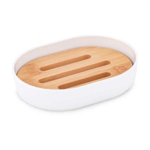 Мыльница для хранения мыла. Емкость мыльницы изготовлена из качественного пластика, вставка произведена из натурального растительного материала - бамбук. Пластик не подвержен внешним воздействиям, легко моется и не желтеет со временем. Вставка из бамбука имеет специальную обработку, которая защитит ее от размокания и плесени. Вставка имеет три отверстия для слива воды, благодаря чему мыло не будет размокать. Мыльница имеет оригинальный дизайн за счет сочетания двух разных материалов.