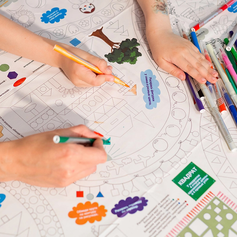 Скатерть из полимерного материала, на которой не только можно, но и нужно рисовать. Разнообразные рисунки привлекут внимание детей и займут их надолго, а после раскрашивания этой яркой скатертью можно накрыть стол.