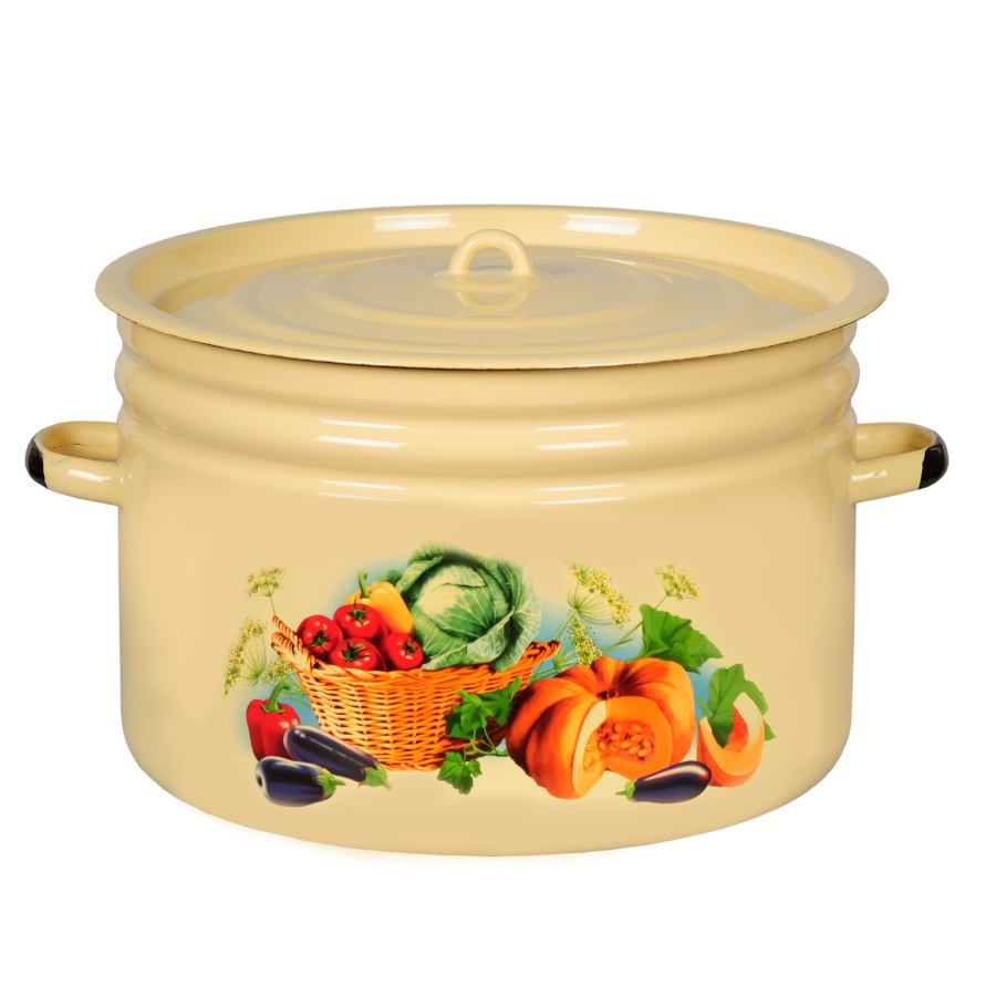 Эмалированный бак с крышкой. Подходит для приготовления, хранения, переноски пищевых продуктов и других хозяйственных целей. Благодаря безопасному эмалевому покрытию все продукты защищены от окисления и соприкосновения с металлом. Бак можно нагревать на любых плитах.