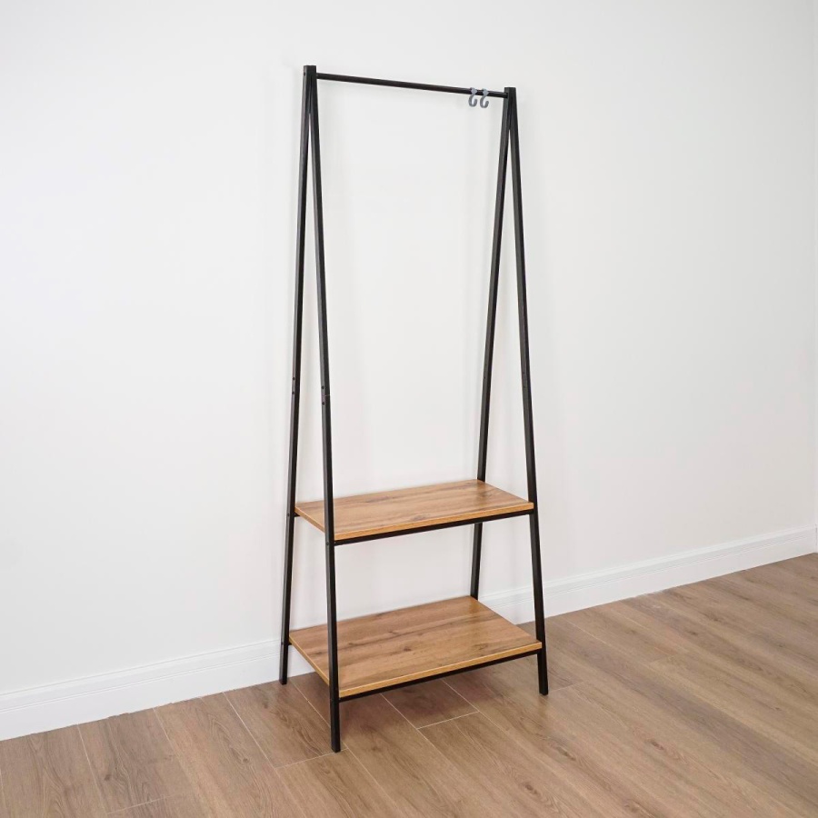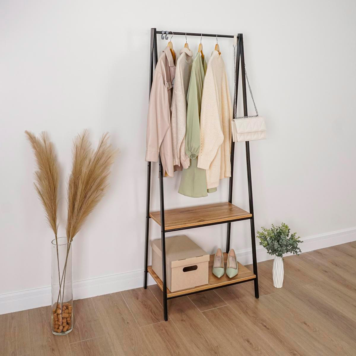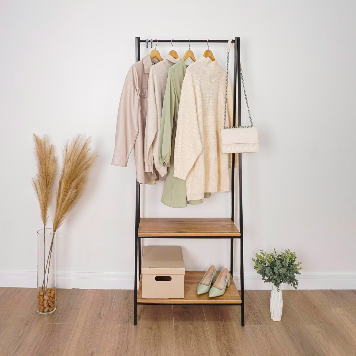 Гардеробная вешалка для хранения одежды и обуви, с полками и крючками.