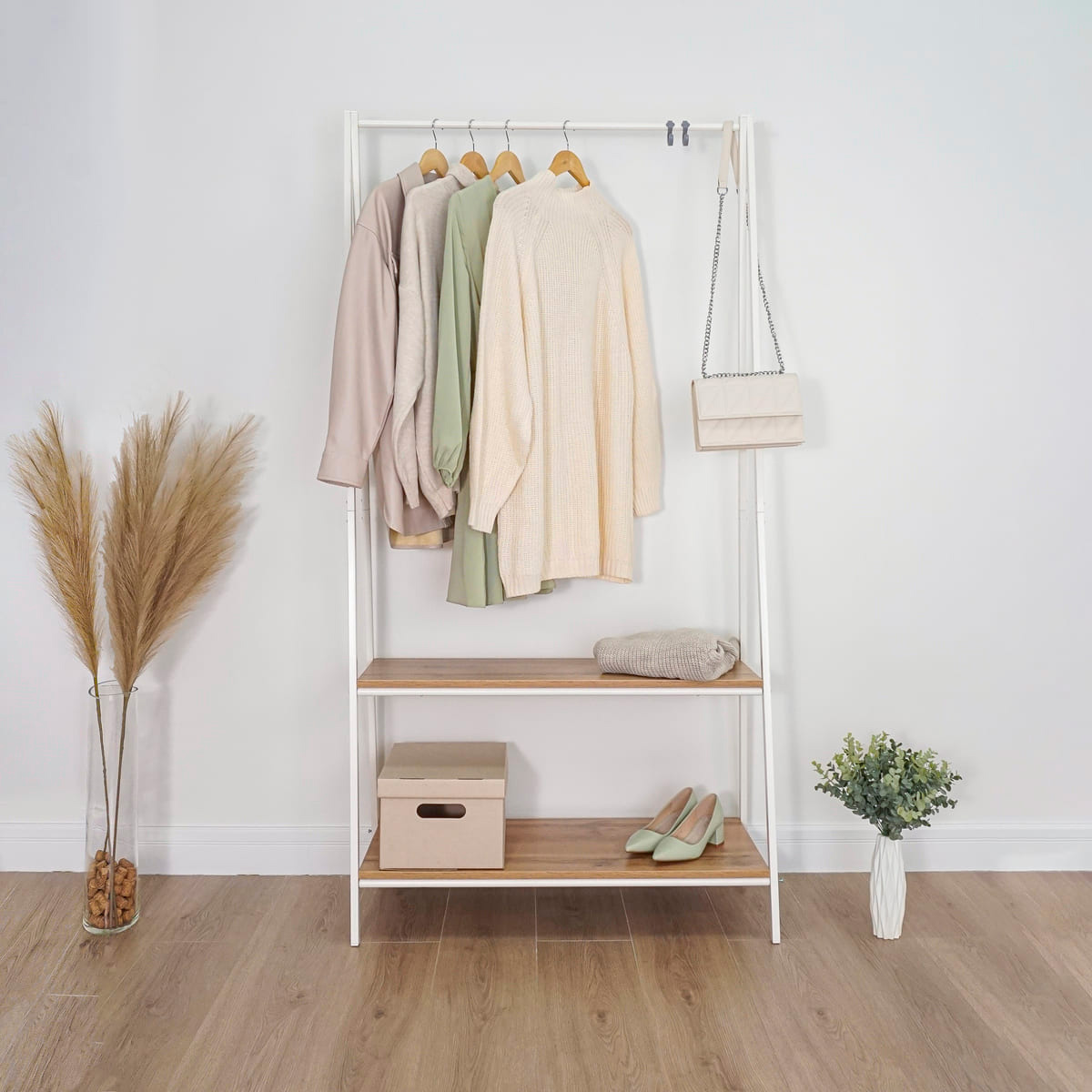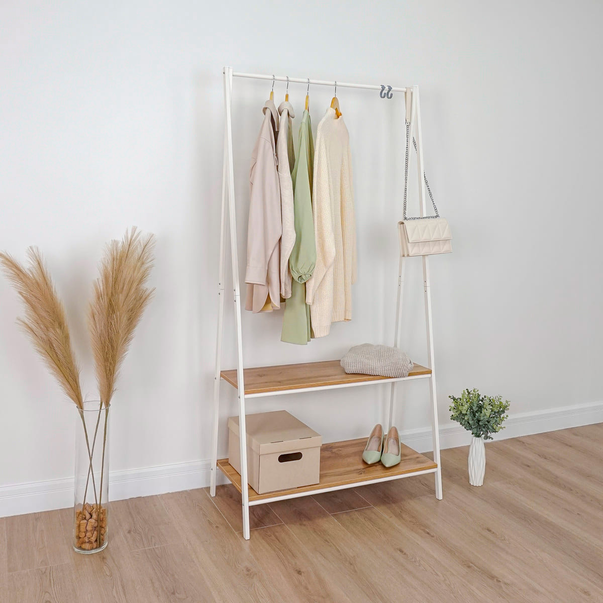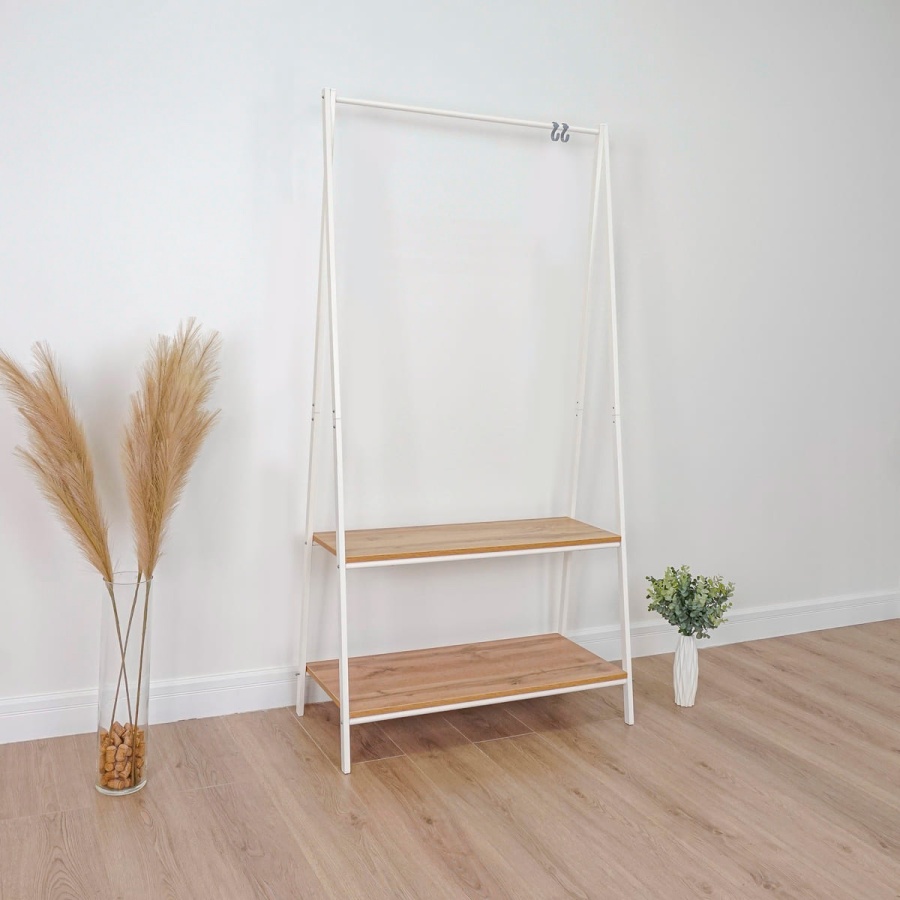 Гардеробная вешалка для хранения одежды и обуви, с полками и крючками.