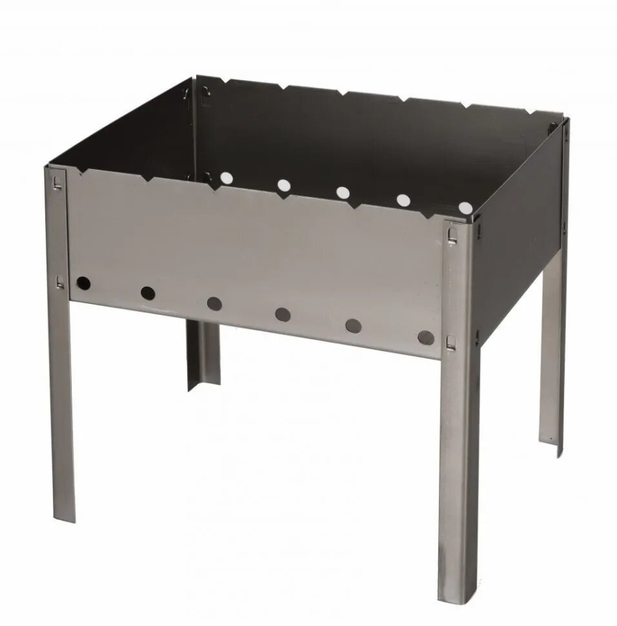 Мангал на ножках, разборный. Собирается изделие быстро, сложностей в порядке сбора и разбора деталей нет. Толщина стенок изделия 1,4 мм его хватит на несколько сезонов использования. Стенки мангала задерживают получаемый на углях жар и не дают раздувать его ветру. На них сделаны полукруглые прорези для размещения 6 шампуров. Нижняя часть стенок перфорирована для лучшей циркуляции воздуха в мангале.