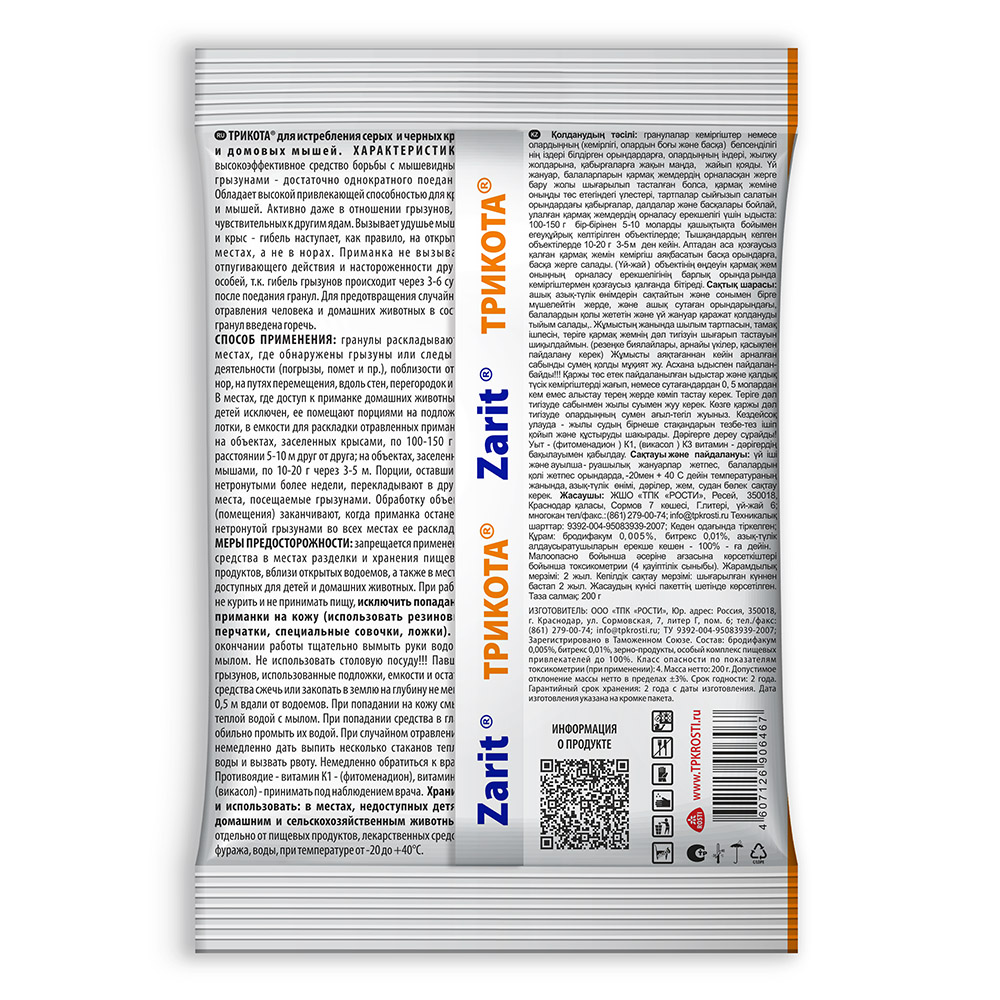 Гранулы от мышей и крыс "Истребитель Трикота" - высокоэффективное средство борьбы с мышевидными грызунами - достаточно однократного поедания. Обладает высокой привлекающей способностью для крыс и мышей. Активно даже в отношении грызунов, не чувствительных к другим ядам. Вызывает удушье мышей и крыс -гибель наступает, как правило, на открытых местах, а не в норах. Приманка не вызывает отпугивающего действия и настороженности других особей, т.к. гибель грызунов происходит через 3-6 суток после поедания брикетов. Для предотвращения случайного отравления человека и домашних животных в состав брикетов введена горечь.